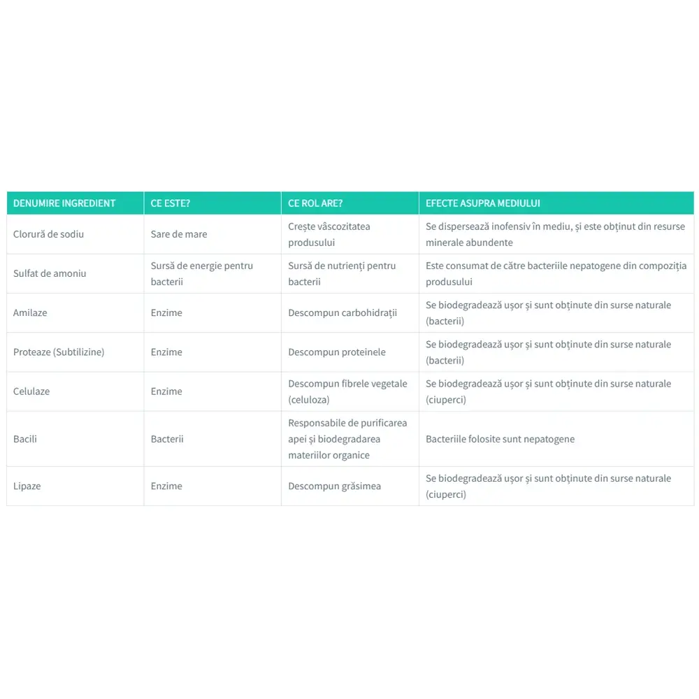 Produsul conține și bacteriiprobioticeinofensive, care optimizează funcționarea foselor septice, prin secreția de noi enzime și biodegradarea materiei organice.