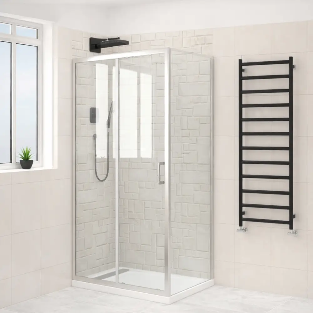 Cabină de duș modernă, ideală pentru băi contemporane, realizată din sticlă securizată transparentă de 6 mm, care oferă un aspect elegant și luminos. Sistemul este compus din o ușă culisantă și două panouri fixe, asigurând acces facil și stabilitate optimă.