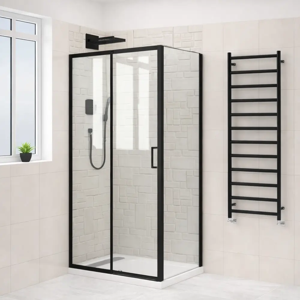 Cabină de duș modernă, ideală pentru băi contemporane, realizată din sticlă securizată transparentă de 6 mm, care oferă un aspect elegant și luminos. Sistemul este compus din o ușă culisantă și două panouri fixe, asigurând acces ușor și stabilitate.