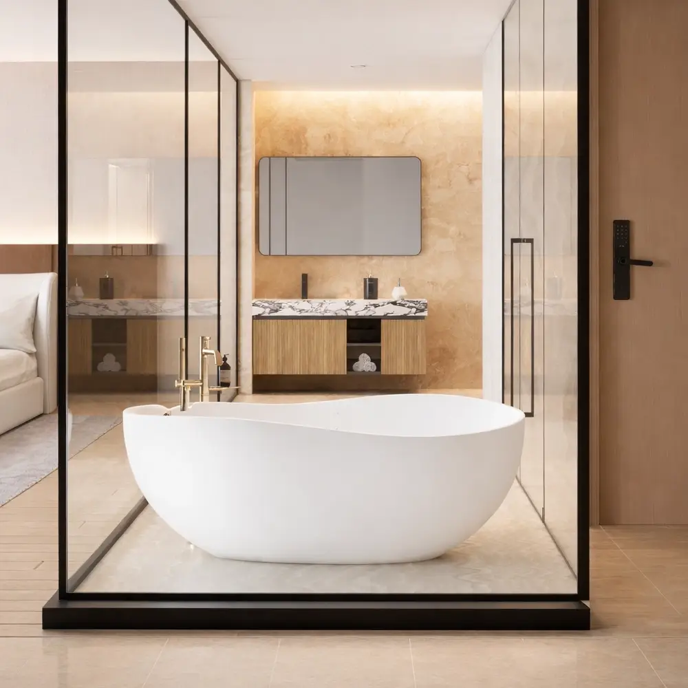Cadă freestanding cu design modern și elegant, realizată din Corian de înaltă calitate, ideală pentru băi contemporane sau amenajări premium. Forma ovală ergonomică și dimensiunile generoase de 160 × 80 cm asigură un confort ridicat și o experiență de relaxare superioară.