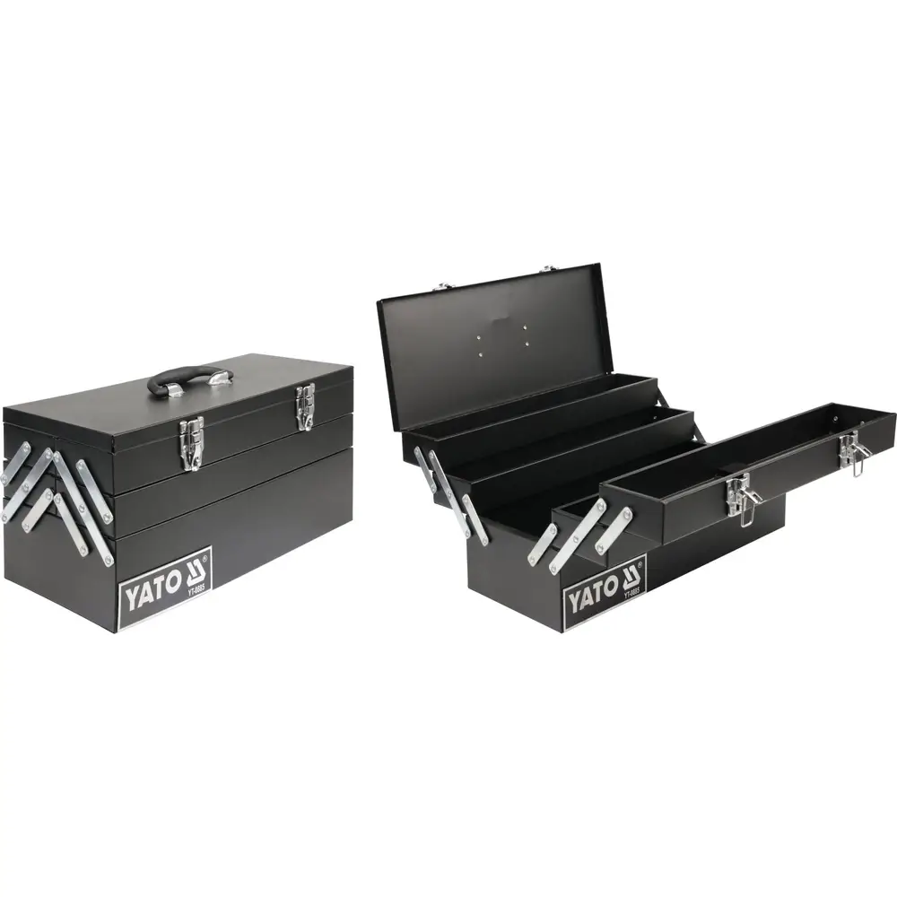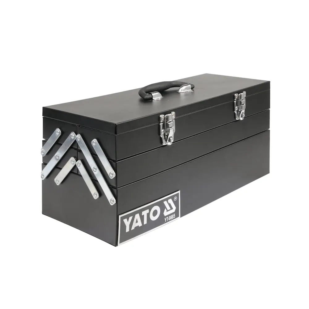 Cutia de scule YATO este fabricat din tablă de 0,6 mm, vopsita în câmp electrostatic. Produsul se caracterizează prin construcție robustă, rezistentă, doua balamale metalice si un spatiu de depozitare generos.