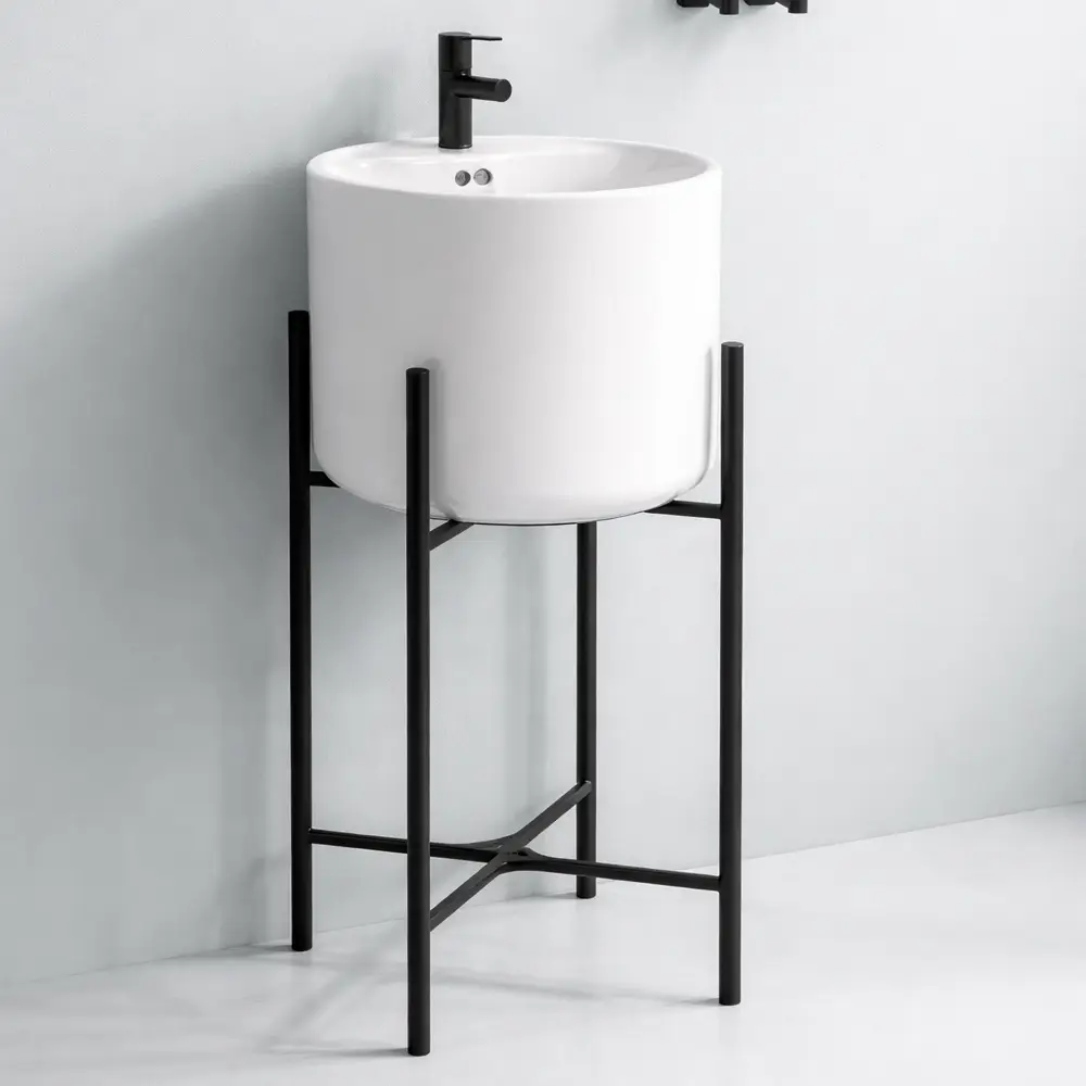 avoarul Modena cu suport se distinge prin designul său modern și minimalist, fiind o alegere ideală pentru băi contemporane sau spații cu stil industrial elegant. Lavoarul ceramic cu formă cilindrică este pus în valoare de suportul metalic negru, cu structură stabilă și linii subțiri, care creează un contrast vizual rafinat.