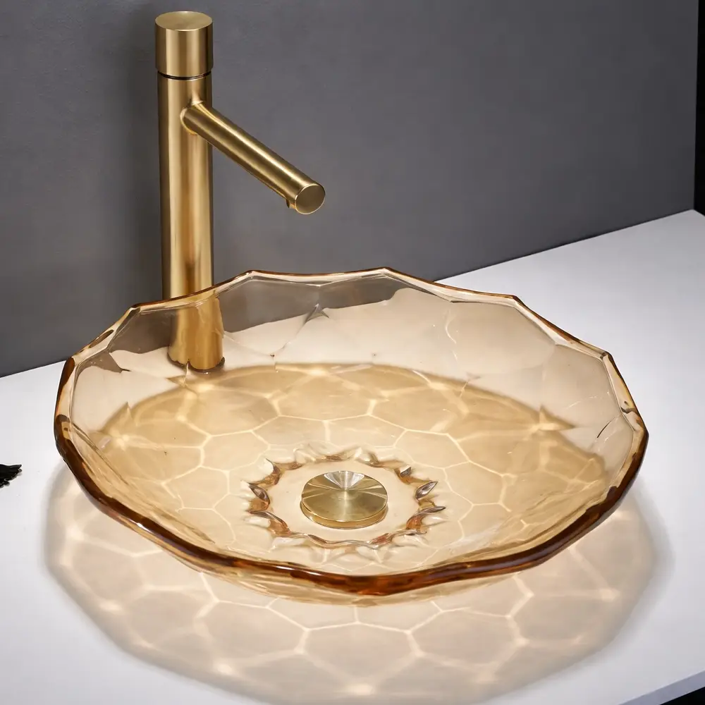 Lavoarul Aqua GL37A este un lavoar ceramic pe blat, cu un design elegant și formă rotundă, inspirată din texturi naturale. Finisajul auriu, cu efect decorativ și suprafață ușor translucidă, creează un joc subtil de lumină, oferind băii un aspect modern și rafinat.