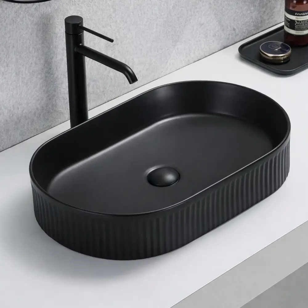 Lavoarul Linea impresionează prin designul său modern și rafinat, evidențiat de finisajul negru mat și de detaliile verticale decorative de pe exterior. Forma ovală alungită conferă eleganță și echilibru, fiind ideală pentru băi contemporane, minimaliste sau cu accente industriale.