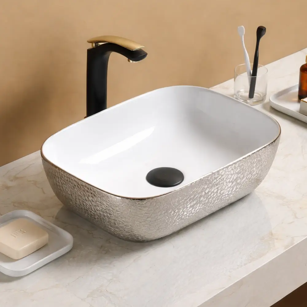 Interiorul alb lucios creează o senzație de curățenie și luminozitate, în timp ce exteriorul argintiu cu textură decorativă adaugă un accent elegant și sofisticat. Realizat din ceramică de înaltă calitate, lavoarul este durabil, rezistent și ușor de întreținut, potrivit pentru utilizare zilnică.