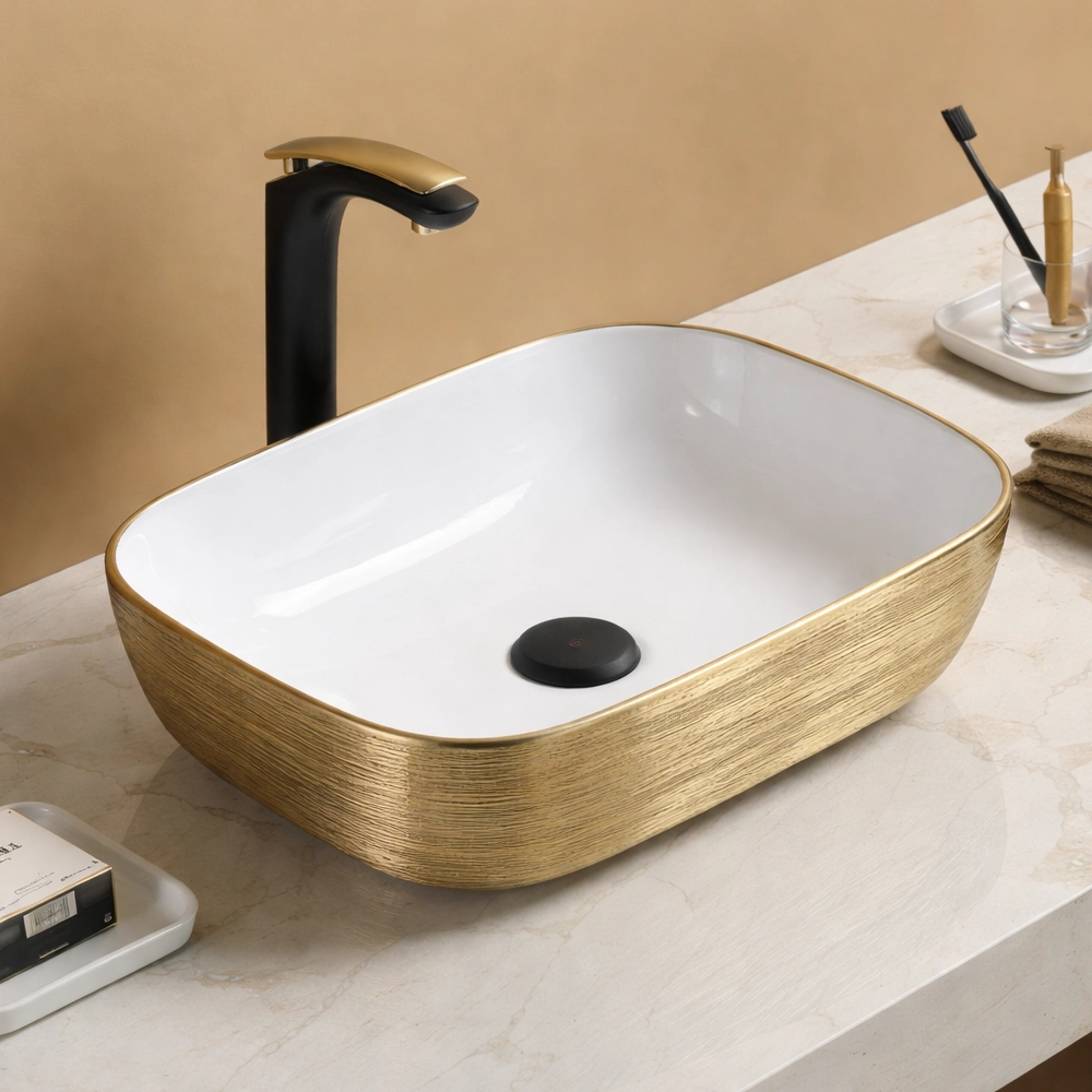 Interiorul alb lucios asigură un aspect curat și luminos, în timp ce exteriorul auriu cu textură fină adaugă un accent sofisticat și luxos. Realizat din ceramică de înaltă calitate, lavoarul este rezistent, durabil și ușor de întreținut.
