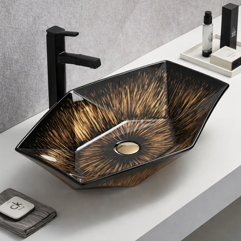 Lavoarul Regal 78666 este un lavoar ceramic pe blat cu design spectaculos și formă geometrică modernă, ideal pentru băi premium. Finisajul negru lucios la exterior, completat de interiorul auriu cu efect radial decorativ, creează un contrast puternic și un impact vizual deosebit.