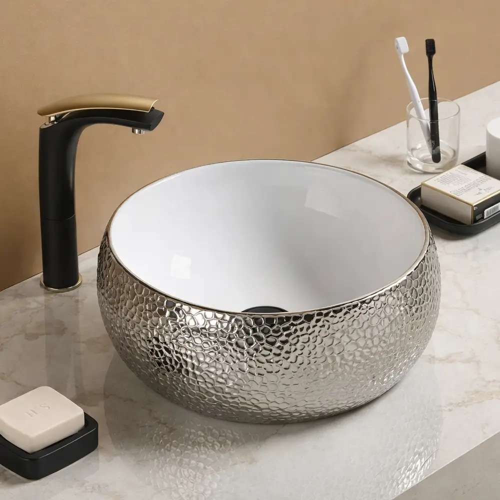 Interiorul alb lucios oferă un aspect curat și luminos, iar exteriorul argintiu cu textură decorativă adaugă un accent sofisticat și un plus de lux. Realizat din ceramică de înaltă calitate, lavoarul este rezistent, durabil și ușor de întreținut, fiind potrivit pentru utilizare zilnică.