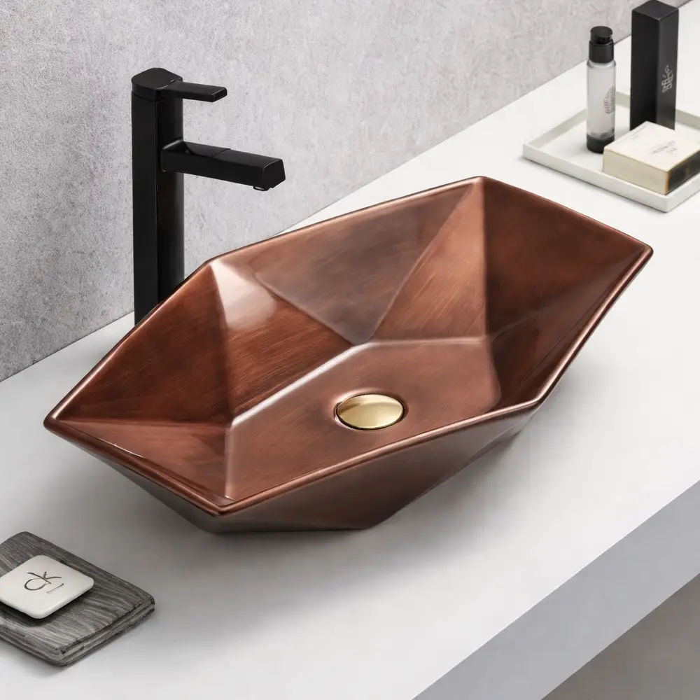 Finisajul cupru cu efect metalizat oferă un aer elegant și cald, fiind ușor de integrat în combinație cu baterii negre, aurii sau cupru. Materialul ceramic de înaltă calitate asigură durabilitate, rezistență și întreținere ușoară, chiar și în utilizare zilnică.