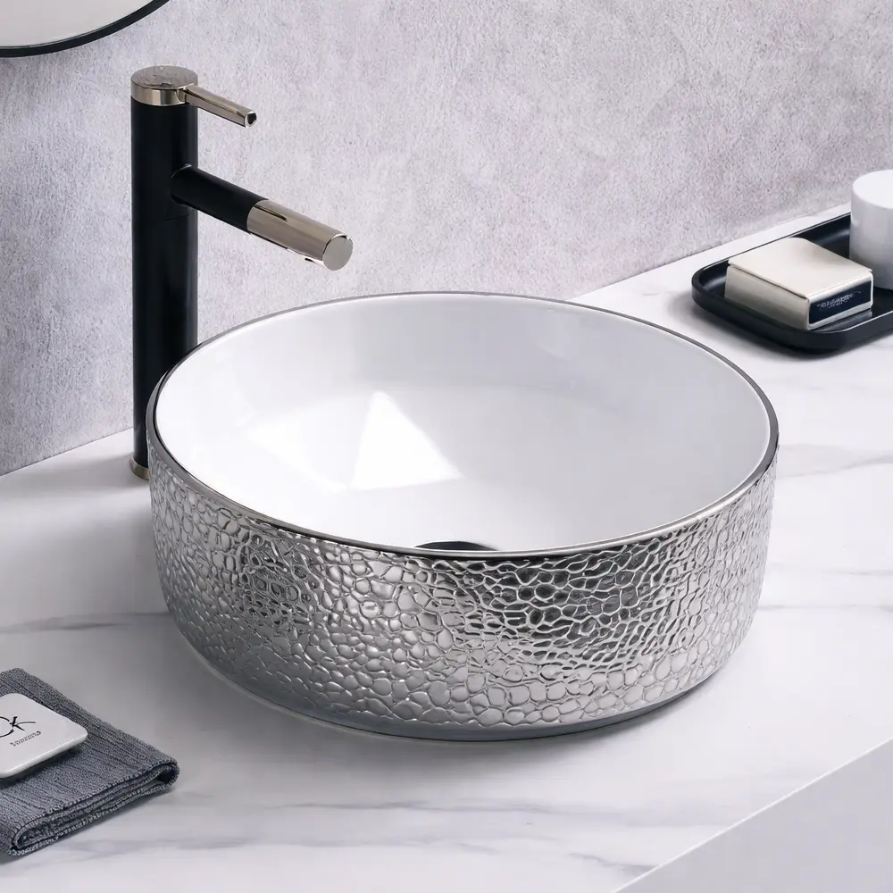 Interiorul alb lucios oferă un aspect curat și luminos, în timp ce exteriorul argintiu cu textură decorativă tip „hammered” adaugă un accent elegant și un plus de rafinament. Realizat din ceramică de înaltă calitate, lavoarul este rezistent, durabil și ușor de întreținut, fiind potrivit pentru utilizare zilnică.