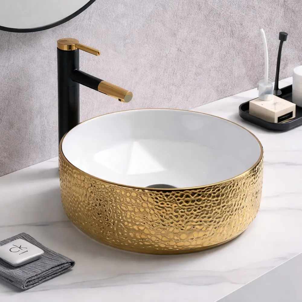 Interiorul alb lucios oferă un aspect curat și luminos, în timp ce exteriorul auriu cu textură decorativă tip „hammered” adaugă un accent elegant și un plus de rafinament. Realizat din ceramică de înaltă calitate, lavoarul este rezistent, durabil și ușor de întreținut, fiind potrivit pentru utilizare zilnică.