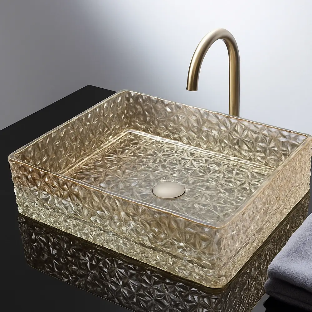Lavoarul dreptunghiular din sticlă este alegerea perfectă pentru băile moderne, adăugând un plus de eleganță și rafinament. Realizat din sticlă premium cu model geometric 3D, acesta creează reflexii spectaculoase și oferă un aspect luxos oricărui blat de baie.
