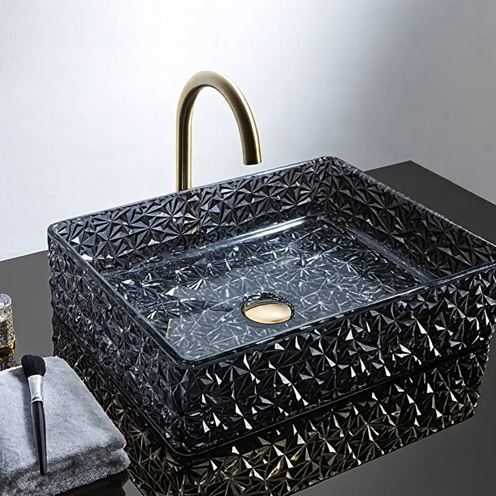 Lavoarul dreptunghiular din sticlă este alegerea perfectă pentru băile moderne, adăugând un plus de eleganță și rafinament. Realizat din sticlă premium cu model geometric 3D, acesta creează reflexii spectaculoase și oferă un aspect luxos oricărui blat de baie.