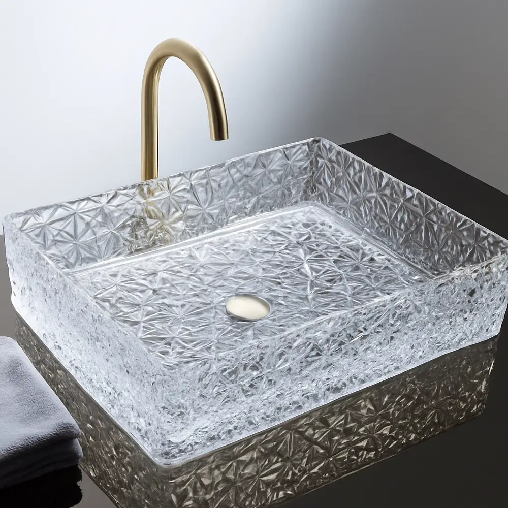 Lavoarul dreptunghiular din sticlă este alegerea perfectă pentru băile moderne, adăugând un plus de eleganță și rafinament. Realizat din sticlă premium cu model geometric 3D, acesta creează reflexii spectaculoase și oferă un aspect luxos oricărui blat de baie.