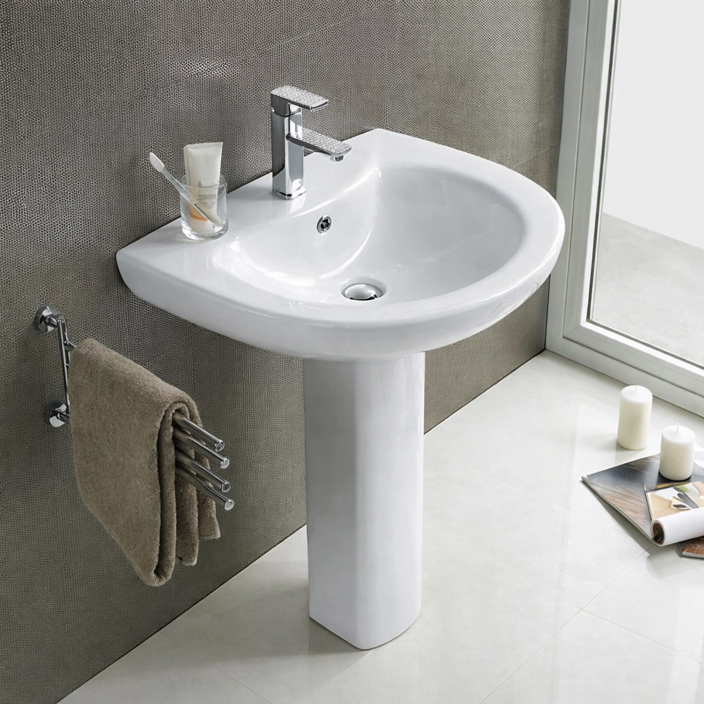 Realizat din ceramică de înaltă calitate, cu finisaj alb lucios, lavoarul este durabil, rezistent și ușor de întreținut. Montajul pe podea, cu piedestal integrat, maschează elegant instalațiile sanitare și contribuie la un design curat și ordonat al băii.