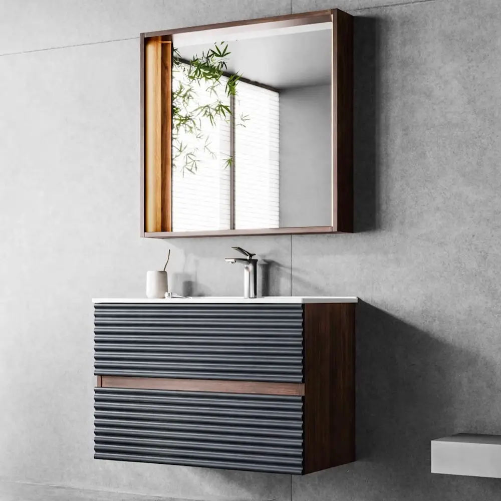 Lavoarul ceramic, subțire și rezistent, este perfect adaptat mobilierului, iar compartimentarea eficientă asigură spațiu generos pentru depozitarea produselor de baie.
