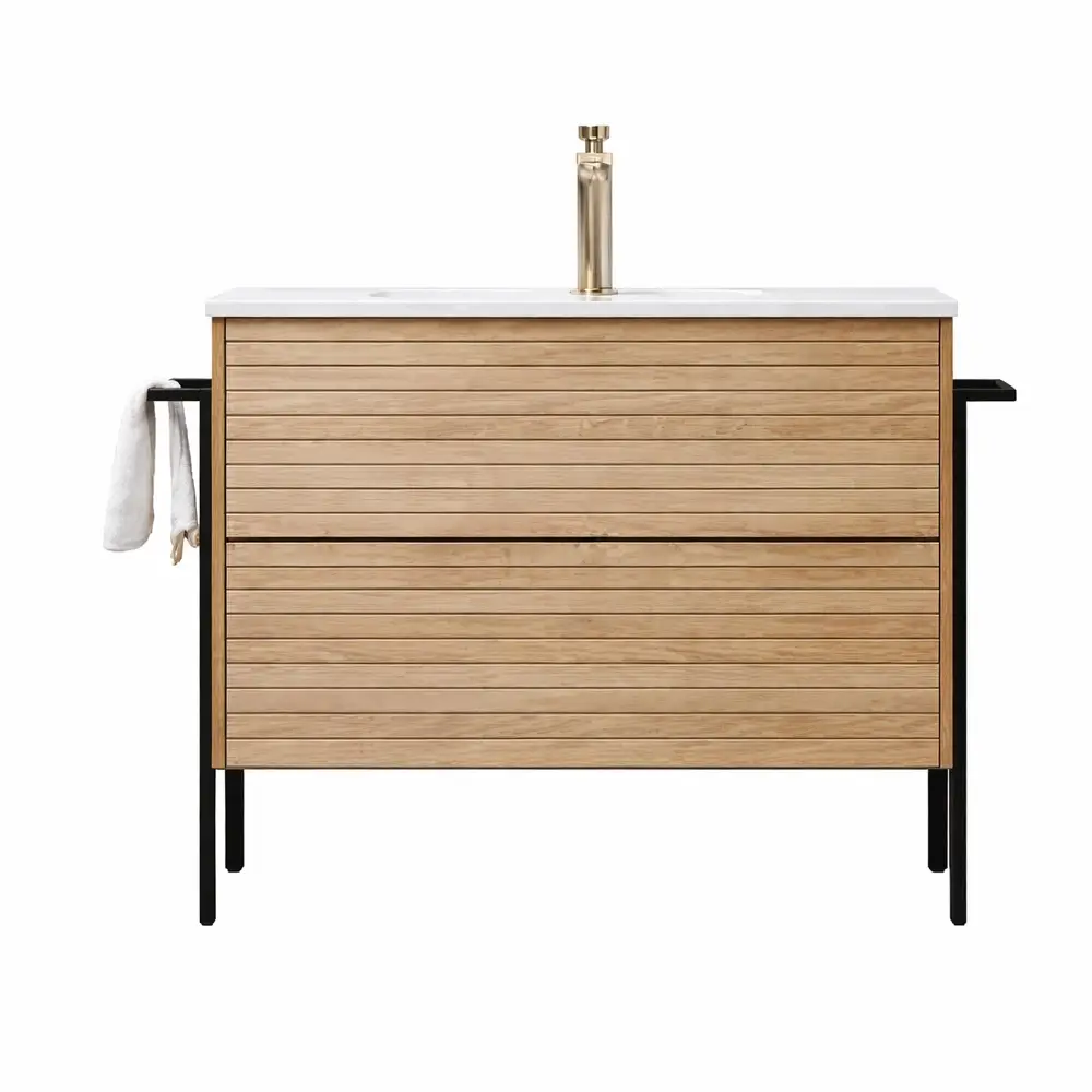 Dulapul principal este prevăzut cu două sertare spațioase, oferind un acces facil la produsele de igienă și accesoriile de baie. Acesta este susținut de picioare din oțel inoxidabil, de culoare neagră, care conferă stabilitate și un aspect modern.