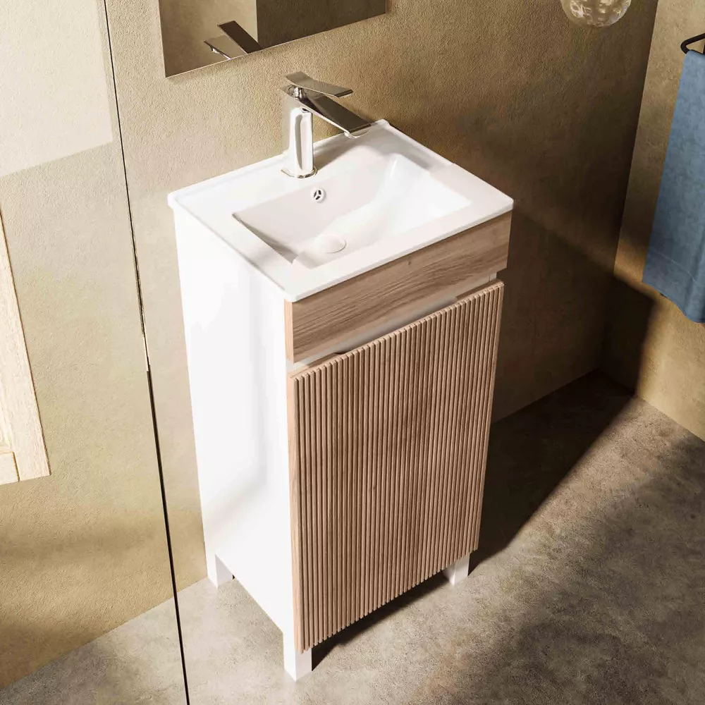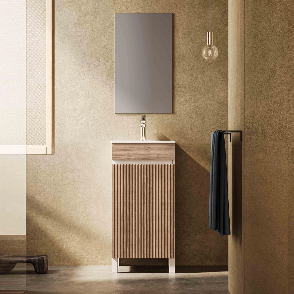 Mobilierul de baie Zarena este ideal pentru băi mici sau spații moderne, având un design elegant cu front striat vertical în finisaj de lemn, combinat cu carcasă albă. Stilul minimalist oferă un aspect modern și aerisit, iar dimensiunea compactă îl face ușor de integrat în orice baie.