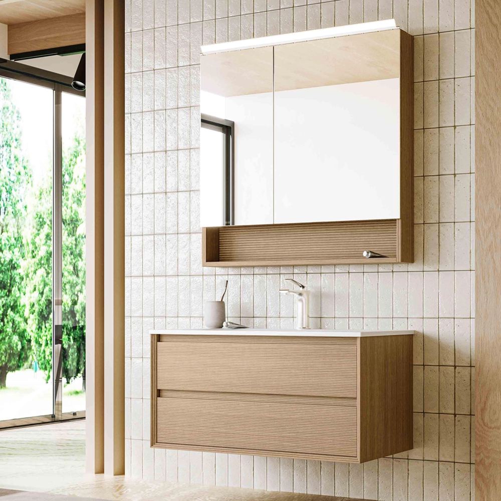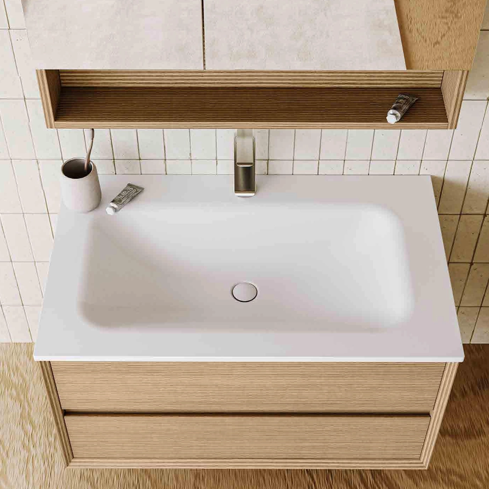 Lavoarul inclus este realizat din rășină, având deschidere verticală, fiind ușor de întreținut și perfect integrat în designul mobilierului.