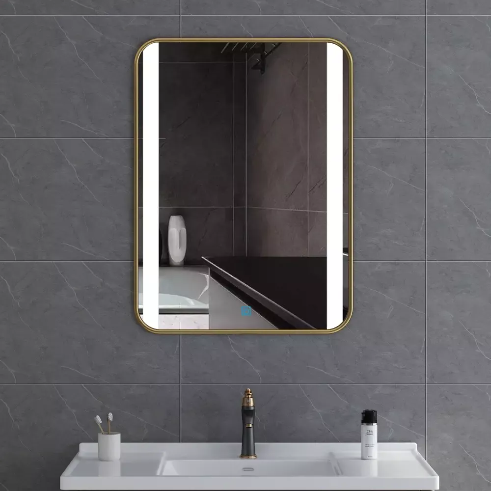 Oglinda LED Virena 60 × 80 cm, DH-6080BLMG îmbină eleganța clasică cu funcționalitatea modernă, fiind ideală pentru băi amenajate în stil contemporan sau premium. Forma dreptunghiulară cu colțuri rotunjite este completată de o ramă subțire cu finisaj auriu, care adaugă un accent rafinat și cald spațiului.