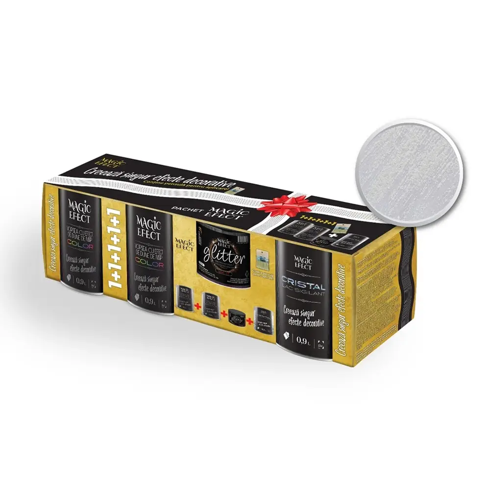 Pachetul PROMOTIONAL de 1+1+ pensula acopera 16 mp ( 8mp/ 0.9L )+ glitter alb + lac. Consumul poate varia în funcție de grosime strat și efectul dorit.