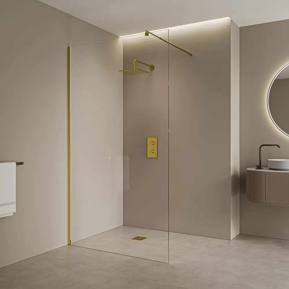 Paravanul de duș fix DY101 este realizat din sticlă clară securizată de 8 mm, profil auriu, oferă un aspect modern și elegant oricărei băi. Stabil, durabil și ușor de întreținut, este potrivit pentru dușurile tip walk-in sau pentru montaj pe cădiță.