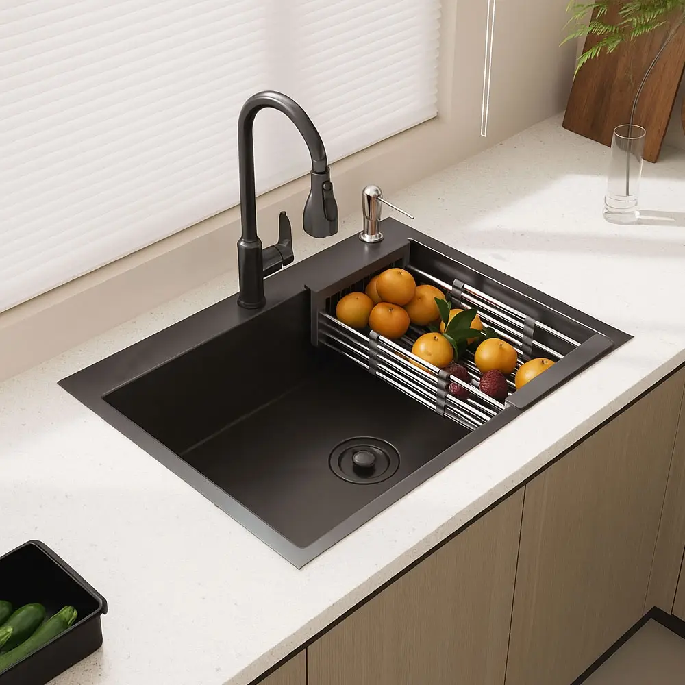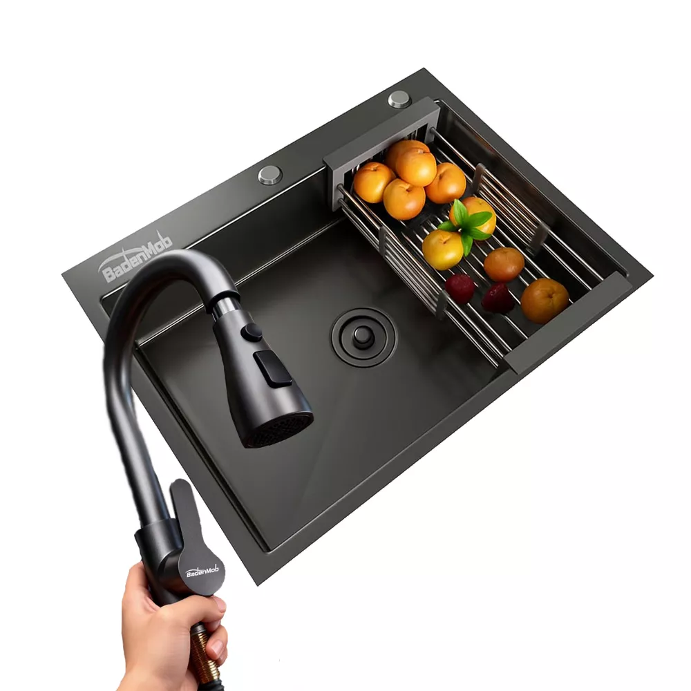 Adaugă un plus de stil și funcționalitate bucătăriei tale cu acest set modern de chiuvetă și baterie, realizat din materiale durabile și cu un design elegant în finisaj negru.